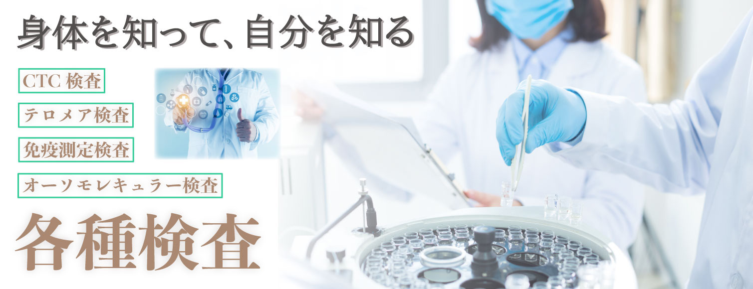 ⾎液検査により、栄養素−適切な⾷事やサプリメント・点滴、糖質コントロールを⽤いて、⾝体を構成する約60兆個の細胞のはたらきを向上させて、検査結果によって必要な治療を⾏います。