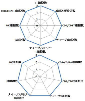 免疫力の測定には、血液を少量採血し、3~10項目のリンパ球の種類、比率、機能などを調べます。それぞれの検査結果を3段階評価し、その合計スコアをさらに5段階に分けて免疫力を評価いたします。更に、検査結果から免疫力年齢も推定いたします。